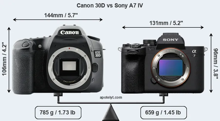 If the front view area (width x height) of the cameras is taken as an aggregate measure of their size, the Sony A7 IV is notably smaller (18 percent) than the Canon 30D. Moreover, the A7 IV is markedly lighter (16 percent) than the 30D. It is noteworthy in this context that the A7 IV is splash and dust-proof, while the 30D does not feature any corresponding weather-sealing.