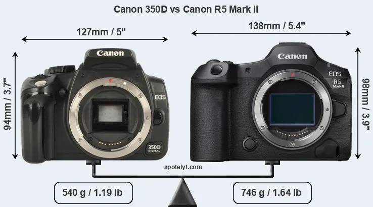 If the front view area (width x height) of the cameras is taken as an aggregate measure of their size, the Canon R5 Mark II is notably larger (13 percent) than the Canon 350D. Moreover, the R5 Mark II is substantially heavier (38 percent) than the 350D. It is noteworthy in this context that the R5 Mark II is splash and dust-proof, while the 350D does not feature any corresponding weather-sealing.