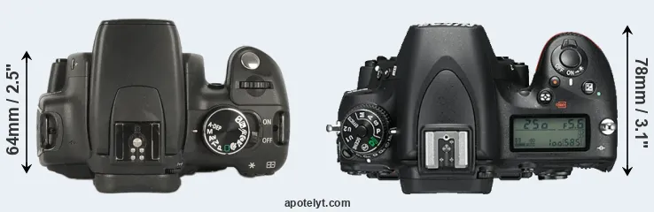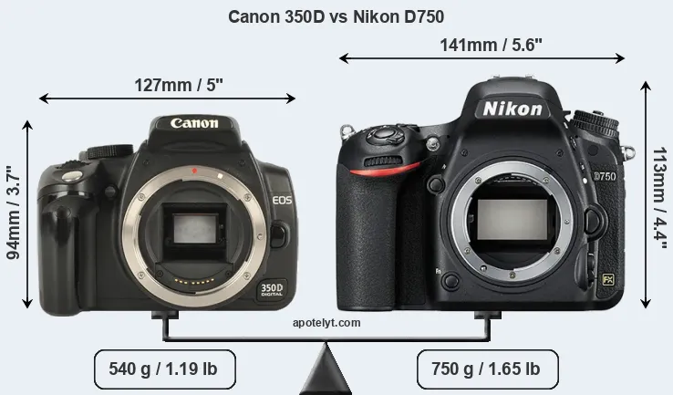 The side-by-side display below illustrates the physical size and weight of the Canon 350D and the Nikon D750. The two cameras are presented according to their relative size. Three consecutive perspectives from the front, the top, and the back are available. All size dimensions are rounded to the nearest millimeter.