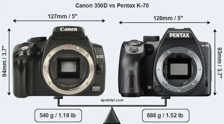 If the front view area (width x height) of the cameras is taken as an aggregate measure of their size, the Pentax K-70 is somewhat smaller (2 percent) than the Canon 350D. However, the K-70 is markedly heavier (27 percent) than the 350D. It is noteworthy in this context that the K-70 is splash and dust-proof, while the 350D does not feature any corresponding weather-sealing.