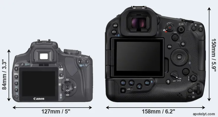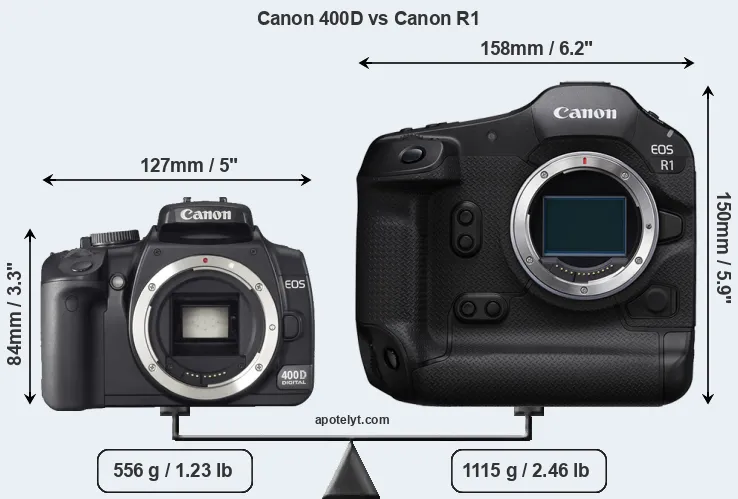 Going beyond this snapshot of core features and characteristics, what are the differences between the Canon EOS 400D and the Canon EOS R1? Which one should you buy? Read on to find out how these two cameras compare with respect to their body size, their imaging sensors, their shooting features, their input-output connections, and their reception by expert reviewers.