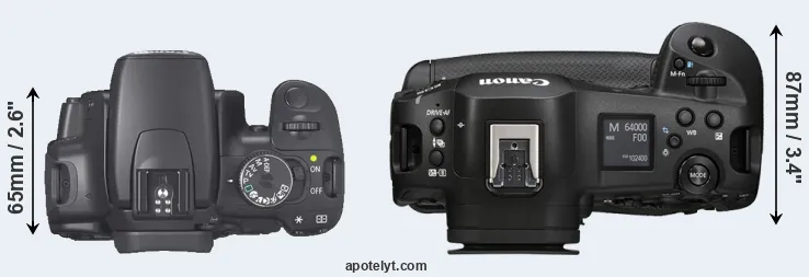 The physical size and weight of the Canon 400D and the Canon R1 are illustrated in the side-by-side display below. The two cameras are presented according to their relative size. Three successive views from the front, the top, and the rear are shown. All width, height and depth dimensions are rounded to the nearest millimeter.
