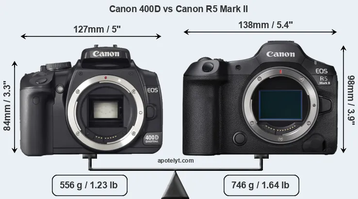 If the front view area (width x height) of the cameras is taken as an aggregate measure of their size, the Canon R5 Mark II is notably larger (27 percent) than the Canon 400D. Moreover, the R5 Mark II is markedly heavier (34 percent) than the 400D. It is noteworthy in this context that the R5 Mark II is splash and dust-proof, while the 400D does not feature any corresponding weather-sealing.