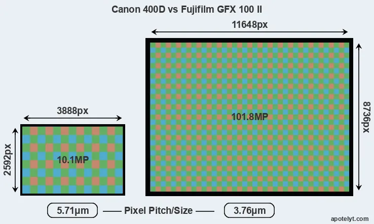 | Sensor Specs | Canon 400D | Fujifilm GFX 100 II |