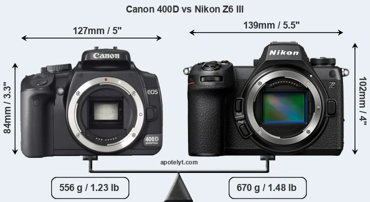 An illustration of the physical size and weight of the Canon 400D and the Nikon Z6 III is provided in the side-by-side display below. The two cameras are presented according to their relative size. Three consecutive views from the front, the top, and the rear side are shown. All width, height and depth measures are rounded to the nearest millimeter.