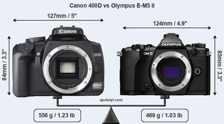 If the front view area (width x height) of the cameras is taken as an aggregate measure of their size, the Olympus E-M5 II is somewhat smaller (1 percent) than the Canon 400D. Moreover, the E-M5 II is markedly lighter (16 percent) than the 400D. It is noteworthy in this context that the E-M5 II is splash and dust-proof, while the 400D does not feature any corresponding weather-sealing.