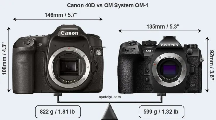 If the front view area (width x height) of the cameras is taken as an aggregate measure of their size, the OM System OM-1 is notably smaller (21 percent) than the Canon 40D. Moreover, the OM-1 is markedly lighter (27 percent) than the 40D. It is noteworthy in this context that the OM-1 is splash and dust-proof, while the 40D does not feature any corresponding weather-sealing.