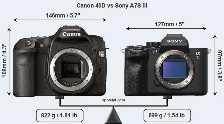 If the front view area (width x height) of the cameras is taken as an aggregate measure of their size, the Sony A7S III is notably smaller (22 percent) than the Canon 40D. Moreover, the A7S III is markedly lighter (15 percent) than the 40D. It is noteworthy in this context that the A7S III is splash and dust-proof, while the 40D does not feature any corresponding weather-sealing.