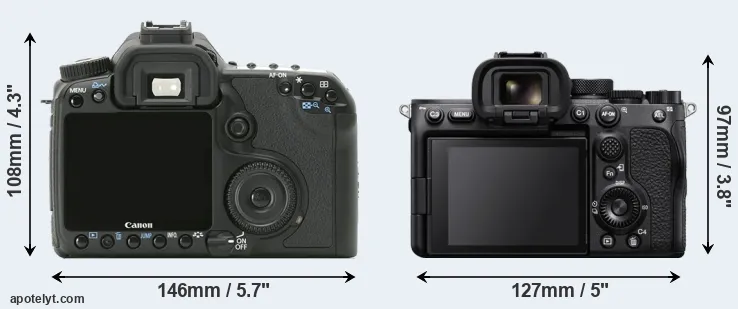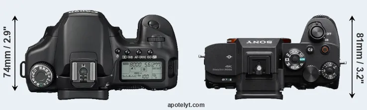 The physical size and weight of the Canon 40D and the Sony A7S III are illustrated in the side-by-side display below. The two cameras are presented according to their relative size. Three successive views from the front, the top, and the rear are shown. All width, height and depth measures are rounded to the nearest millimeter.