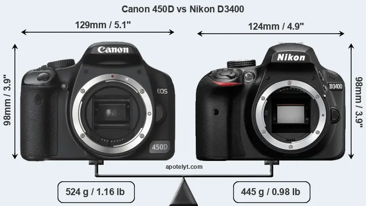 An illustration of the physical size and weight of the Canon 450D and the Nikon D3400 is provided in the side-by-side display below. The two cameras are presented according to their relative size. Three consecutive perspectives from the front, the top, and the back are available. All size dimensions are rounded to the nearest millimeter.
