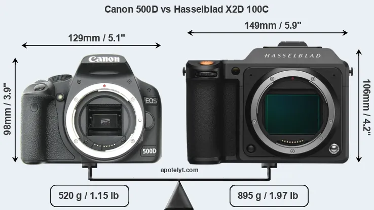 If the front view area (width x height) of the cameras is taken as an aggregate measure of their size, the Hasselblad X2D 100C is notably larger (25 percent) than the Canon 500D. Moreover, the X2D 100C is substantially heavier (72 percent) than the 500D. It is noteworthy in this context that the X2D 100C is splash and dust-proof, while the 500D does not feature any corresponding weather-sealing.