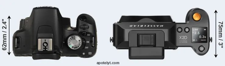 The physical size and weight of the Canon 500D and the Hasselblad X2D 100C are illustrated in the side-by-side display below. The two cameras are presented according to their relative size. Three successive views from the front, the top, and the rear are shown. All width, height and depth measures are rounded to the nearest millimeter.