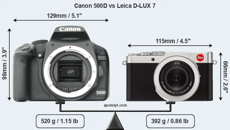 An illustration of the physical size and weight of the Canon 500D and the Leica D-LUX 7 is provided in the side-by-side display below. The two cameras are presented according to their relative size. Three successive views from the front, the top, and the rear are shown. All width, height and depth dimensions are rounded to the nearest millimeter.