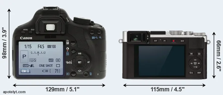 The above size and weight comparisons are to some extent incomplete and possibly misleading, as the D-LUX 7 has a lens built in, whereas the 500D is an interchangeable lens camera that requires a separate lens. Attaching the latter will add extra weight and bulk to the setup. You can compare the optics available for the 500D and their specifications in the Canon EF Lens Catalog.