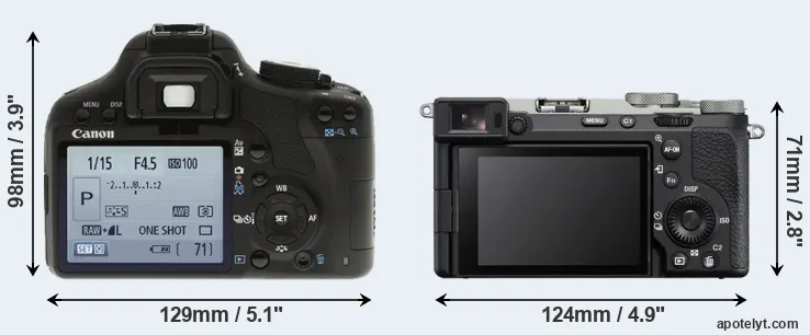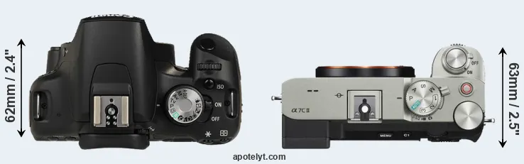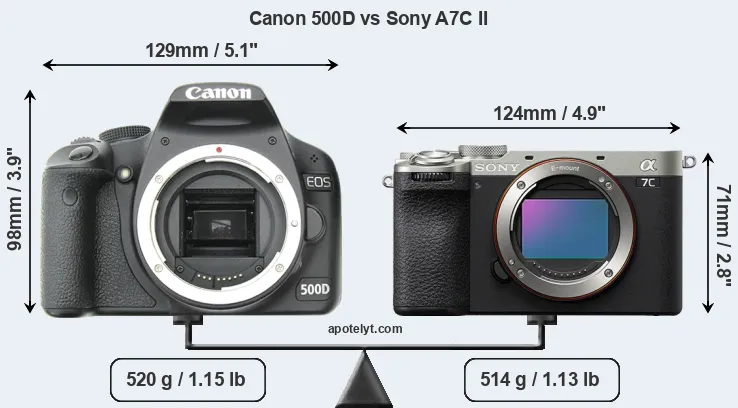 The physical size and weight of the Canon 500D and the Sony A7C II are illustrated in the side-by-side display below. The two cameras are presented according to their relative size. Three successive views from the front, the top, and the rear are shown. All width, height and depth measures are rounded to the nearest millimeter.