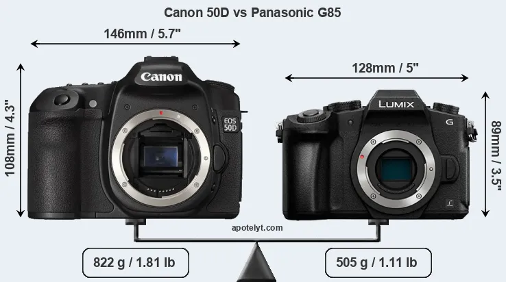 The side-by-side display below illustrates the physical size and weight of the Canon 50D and the Panasonic G85. The two cameras are presented according to their relative size. Three consecutive perspectives from the front, the top, and the back are available. All width, height and depth measures are rounded to the nearest millimeter.