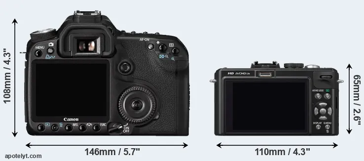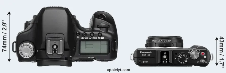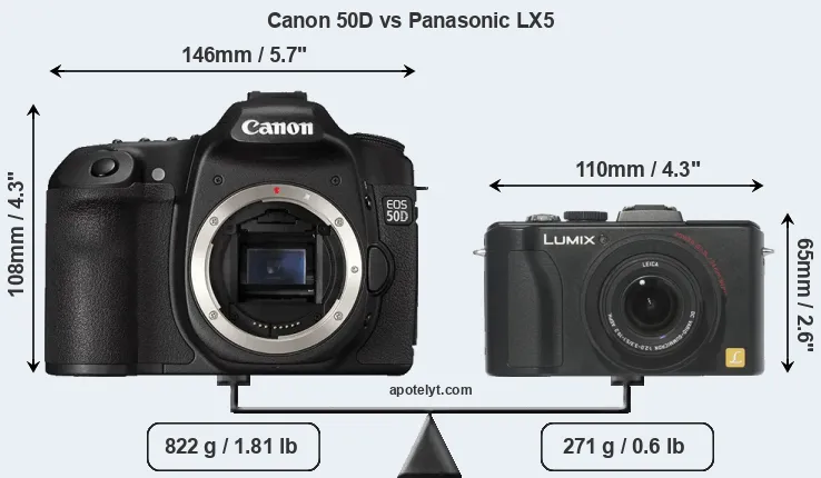 The side-by-side display below illustrates the physical size and weight of the Canon 50D and the Panasonic LX5. The two cameras are presented according to their relative size. Three consecutive perspectives from the front, the top, and the back are available. All width, height and depth dimensions are rounded to the nearest millimeter.