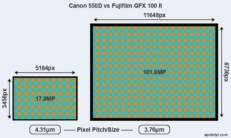 | Sensor Specs | Canon 550D | Fujifilm GFX 100 II |