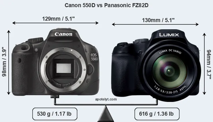 The above size and weight comparisons are to some extent incomplete and possibly misleading, as the FZ82D has a lens built in, whereas the 550D is an interchangeable lens camera that requires a separate lens. Attaching the latter will add extra weight and bulk to the setup. You can compare the optics available for the 550D and their specifications in the Canon EF Lens Catalog.