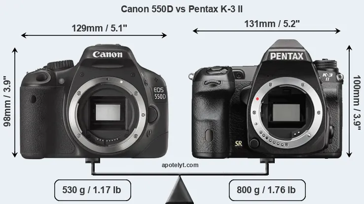 If the front view area (width x height) of the cameras is taken as an aggregate measure of their size, the Pentax K-3 II is somewhat larger (4 percent) than the Canon 550D. Moreover, the K-3 II is substantially heavier (51 percent) than the 550D. It is noteworthy in this context that the K-3 II is splash and dust-proof, while the 550D does not feature any corresponding weather-sealing.
