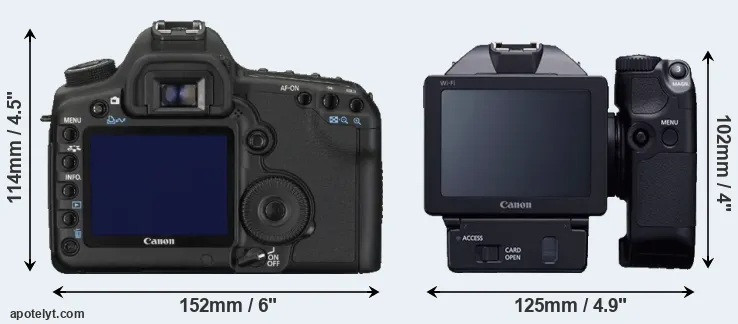 An illustration of the physical size and weight of the Canon 5D Mark II and the Canon XC10 is provided in the side-by-side display below. The two cameras are presented according to their relative size. Three consecutive perspectives from the front, the top, and the back are available. All size dimensions are rounded to the nearest millimeter.