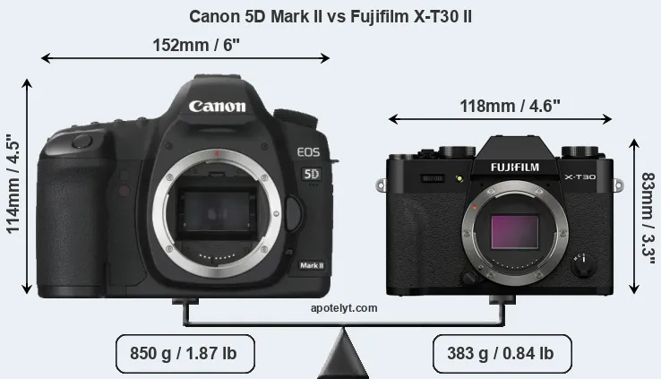 The physical size and weight of the Canon 5D Mark II and the Fujifilm X-T30 II are illustrated in the side-by-side display below. The two cameras are presented according to their relative size. Three consecutive views from the front, the top, and the rear side are shown. All width, height and depth measures are rounded to the nearest millimeter.