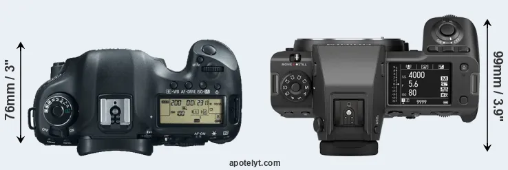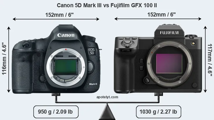 The physical size and weight of the Canon 5D Mark III and the Fujifilm GFX 100 II are illustrated in the side-by-side display below. The two cameras are presented according to their relative size. Three consecutive perspectives from the front, the top, and the back are available. All width, height and depth measures are rounded to the nearest millimeter.