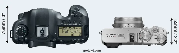 The side-by-side display below illustrates the physical size and weight of the Canon 5D Mark III and the Fujifilm X100VI. The two cameras are presented according to their relative size. Three consecutive perspectives from the front, the top, and the back are available. All width, height and depth measures are rounded to the nearest millimeter.