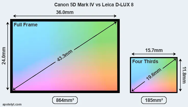 Of the two cameras under consideration, the Canon 5D Mark IV features a full frame sensor and the Leica D-LUX 8 a Four Thirds sensor. The sensor area in the D-LUX 8 is 79 percent smaller. As a result of these sensor size differences, the cameras have a format factor of, respectively, 1.0 and 2.2. The sensor in the 5D Mark IV has a native 3:2 aspect ratio, while the one in the D-LUX 8 offers a 4:3 aspect. The D-LUX 8 has the particularity of featuring a switch that allows to toggle between multiple aspect ratios, while maintaining the same field of view and full image resolution.