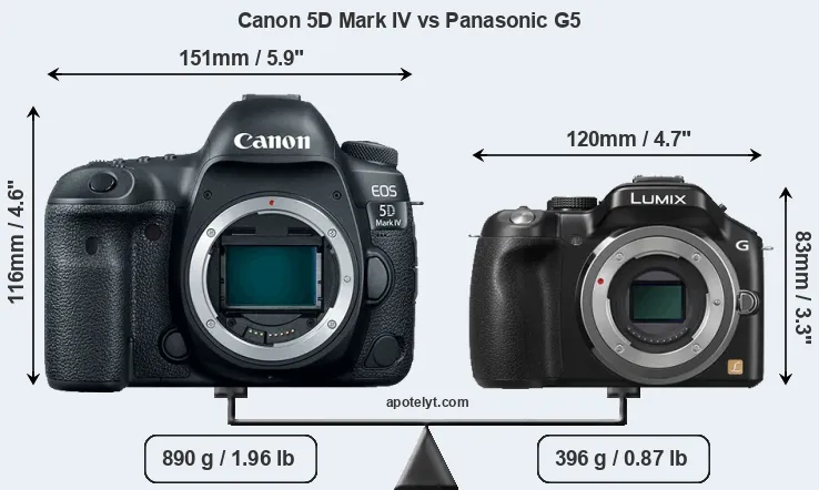 If the front view area (width x height) of the cameras is taken as an aggregate measure of their size, the Panasonic G5 is considerably smaller (43 percent) than the Canon 5D Mark IV. Moreover, the G5 is substantially lighter (56 percent) than the 5D Mark IV. It is worth mentioning in this context that the 5D Mark IV is splash and dust resistant, while the G5 does not feature any corresponding weather-sealing.