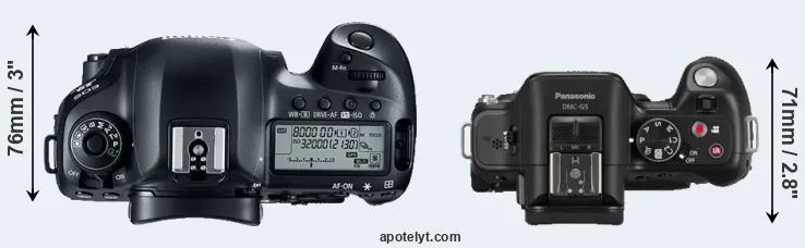 The side-by-side display below illustrates the physical size and weight of the Canon 5D Mark IV and the Panasonic G5. The two cameras are presented according to their relative size. Three successive views from the front, the top, and the rear are shown. All width, height and depth dimensions are rounded to the nearest millimeter.