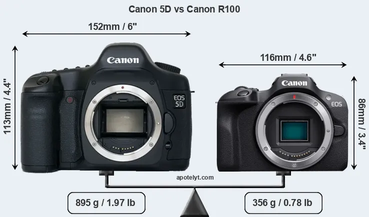 If the front view area (width x height) of the cameras is taken as an aggregate measure of their size, the Canon R100 is considerably smaller (42 percent) than the Canon 5D. Moreover, the R100 is substantially lighter (60 percent) than the 5D. It is worth mentioning in this context that the 5D is splash and dust resistant, while the R100 does not feature any corresponding weather-sealing.