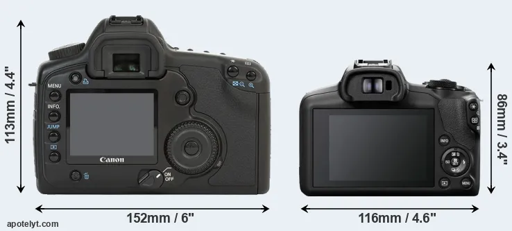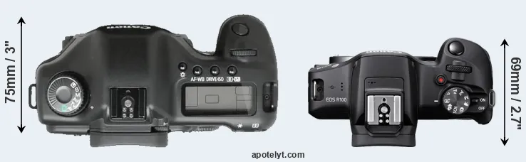The side-by-side display below illustrates the physical size and weight of the Canon 5D and the Canon R100. The two cameras are presented according to their relative size. Three consecutive perspectives from the front, the top, and the back are available. All width, height and depth dimensions are rounded to the nearest millimeter.