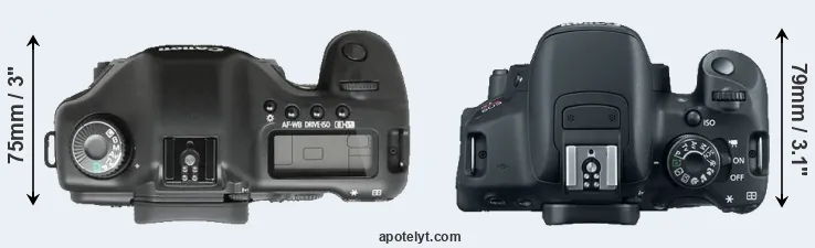The side-by-side display below illustrates the physical size and weight of the Canon 5D and the Canon T5i. The two cameras are presented according to their relative size. Three consecutive perspectives from the front, the top, and the back are available. All width, height and depth measures are rounded to the nearest millimeter.