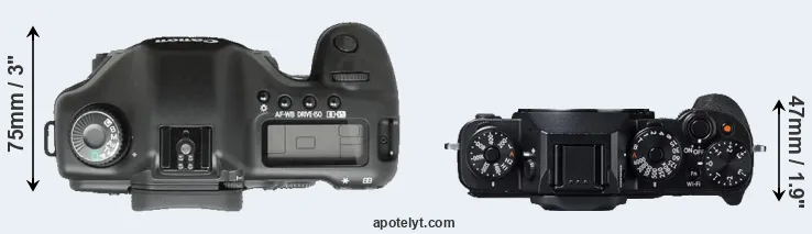 The side-by-side display below illustrates the physical size and weight of the Canon 5D and the Fujifilm X-T1. The two cameras are presented according to their relative size. Three successive views from the front, the top, and the rear are shown. All width, height and depth measures are rounded to the nearest millimeter.