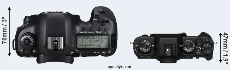 The side-by-side display below illustrates the physical size and weight of the Canon 5DS R and the Fujifilm X-T30 II. The two cameras are presented according to their relative size. Three consecutive views from the front, the top, and the rear side are shown. All size dimensions are rounded to the nearest millimeter.