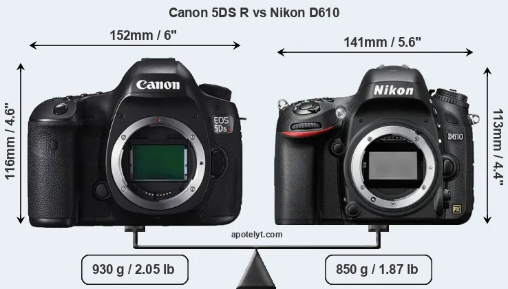 The side-by-side display below illustrates the physical size and weight of the Canon 5DS R and the Nikon D610. The two cameras are presented according to their relative size. Three successive views from the front, the top, and the rear are shown. All width, height and depth measures are rounded to the nearest millimeter.