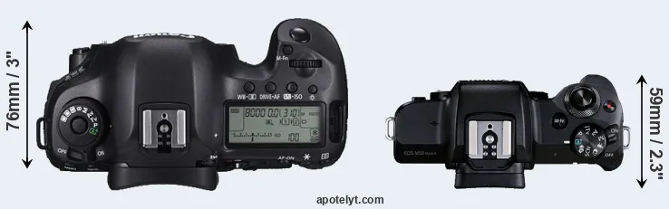 The physical size and weight of the Canon 5DS and the Canon M50 Mark II are illustrated in the side-by-side display below. The two cameras are presented according to their relative size. Three consecutive views from the front, the top, and the rear side are shown. All width, height and depth measures are rounded to the nearest millimeter.