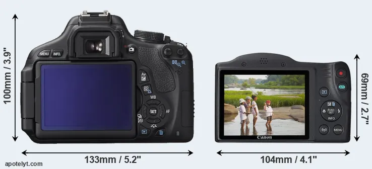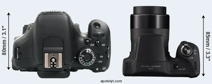 The side-by-side display below illustrates the physical size and weight of the Canon 600D and the Canon SX430. The two cameras are presented according to their relative size. Three consecutive perspectives from the front, the top, and the back are available. All width, height and depth measures are rounded to the nearest millimeter.
