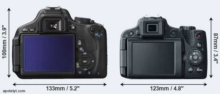 An illustration of the physical size and weight of the Canon 600D and the Canon SX50 is provided in the side-by-side display below. The two cameras are presented according to their relative size. Three successive views from the front, the top, and the rear are shown. All width, height and depth measures are rounded to the nearest millimeter.