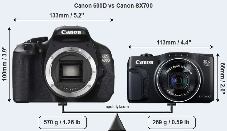 The side-by-side display below illustrates the physical size and weight of the Canon 600D and the Canon SX700. The two cameras are presented according to their relative size. Three consecutive perspectives from the front, the top, and the back are available. All width, height and depth measures are rounded to the nearest millimeter.
