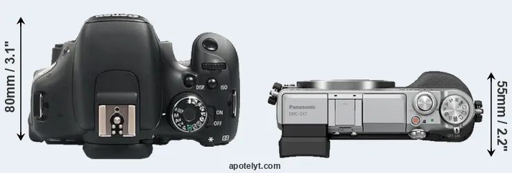 The side-by-side display below illustrates the physical size and weight of the Canon 600D and the Panasonic GX7. The two cameras are presented according to their relative size. Three successive views from the front, the top, and the rear are shown. All size dimensions are rounded to the nearest millimeter.