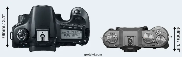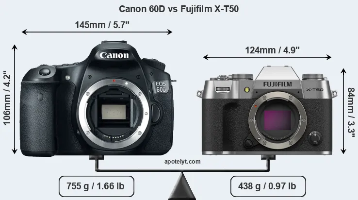 The side-by-side display below illustrates the physical size and weight of the Canon 60D and the Fujifilm X-T50. The two cameras are presented according to their relative size. Three consecutive perspectives from the front, the top, and the back are available. All width, height and depth measures are rounded to the nearest millimeter.