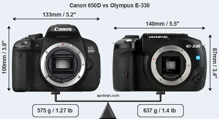 The side-by-side display below illustrates the physical size and weight of the Canon 650D and the Olympus E-330. The two cameras are presented according to their relative size. Three successive views from the front, the top, and the rear are shown. All width, height and depth dimensions are rounded to the nearest millimeter.