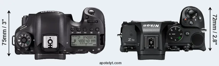 The side-by-side display below illustrates the physical size and weight of the Canon 6D Mark II and the Nikon Z5 II. The two cameras are presented according to their relative size. Three successive views from the front, the top, and the rear are shown. All width, height and depth dimensions are rounded to the nearest millimeter.