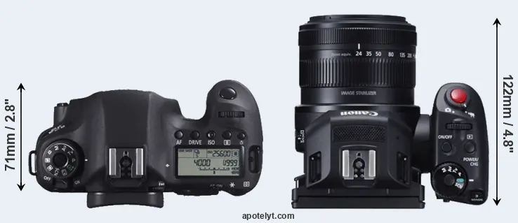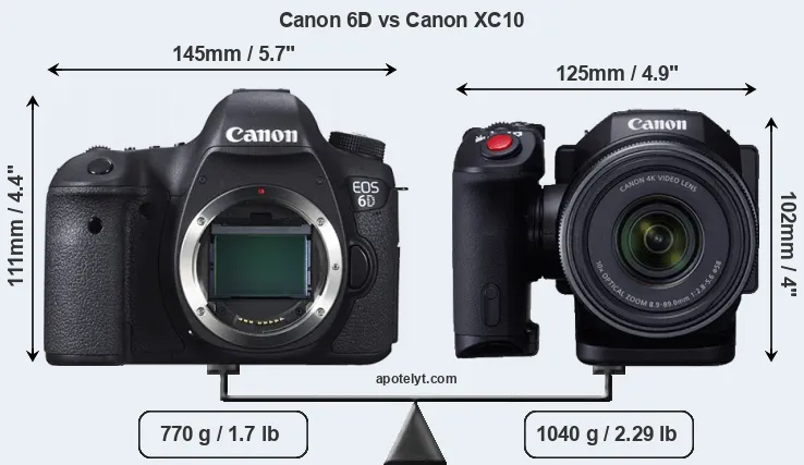 The side-by-side display below illustrates the physical size and weight of the Canon 6D and the Canon XC10. The two cameras are presented according to their relative size. Three successive views from the front, the top, and the rear are shown. All size dimensions are rounded to the nearest millimeter.