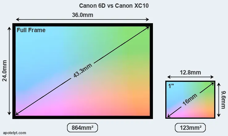 Of the two cameras under consideration, the Canon 6D features a full frame sensor and the Canon XC10 an one-inch sensor. The sensor area in the XC10 is 86 percent smaller. As a result of these sensor size differences, the cameras have a format factor of, respectively, 1.0 and 2.75. The sensor in the 6D has a native 3:2 aspect ratio, while the one in the XC10 offers a 4:3 aspect.