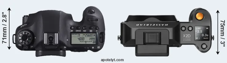 The side-by-side display below illustrates the physical size and weight of the Canon 6D and the Hasselblad X2D 100C. The two cameras are presented according to their relative size. Three consecutive views from the front, the top, and the rear side are shown. All size dimensions are rounded to the nearest millimeter.