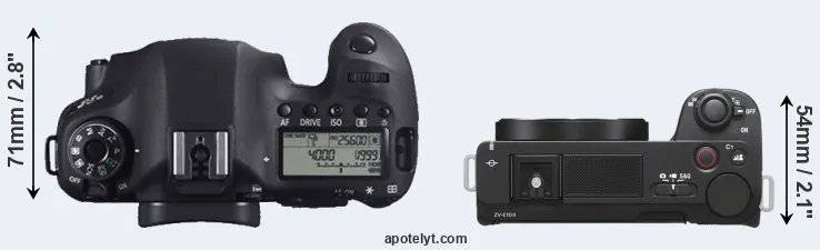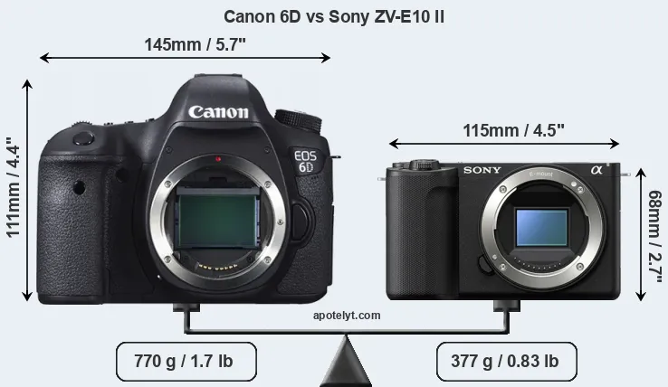 The physical size and weight of the Canon 6D and the Sony ZV-E10 II are illustrated in the side-by-side display below. The two cameras are presented according to their relative size. Three consecutive perspectives from the front, the top, and the back are available. All width, height and depth measures are rounded to the nearest millimeter.