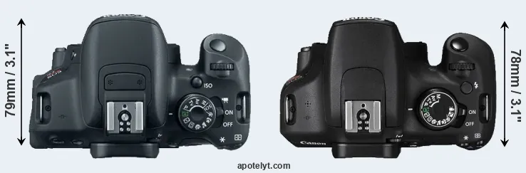 The side-by-side display below illustrates the physical size and weight of the Canon 700D and the Canon T5. The two cameras are presented according to their relative size. Three consecutive perspectives from the front, the top, and the back are available. All width, height and depth measures are rounded to the nearest millimeter.